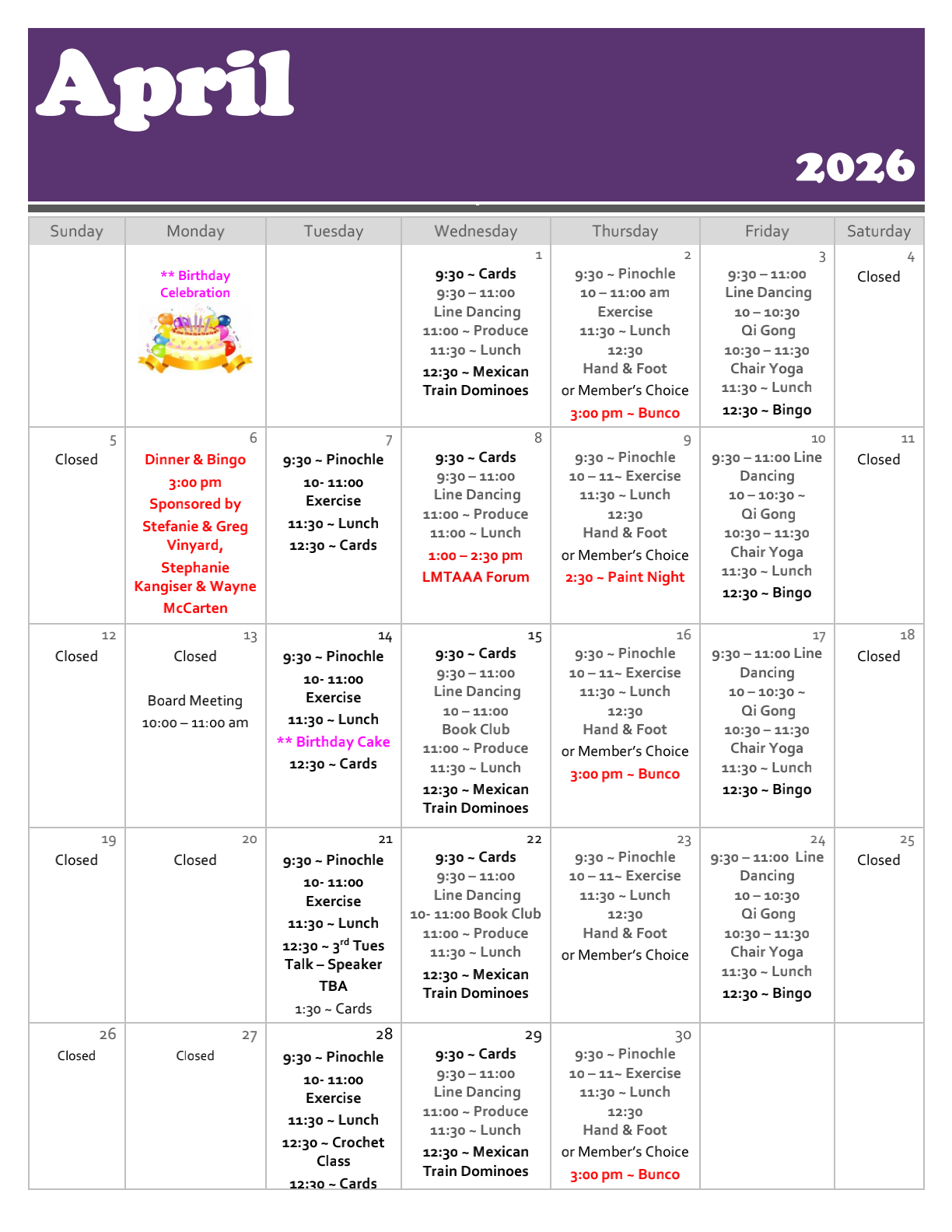 Pinochle is played on Tuesday and Thursdays, at 9:30 am. Our Pinochle peeps are looking for more players. Come and join this fun bunch!